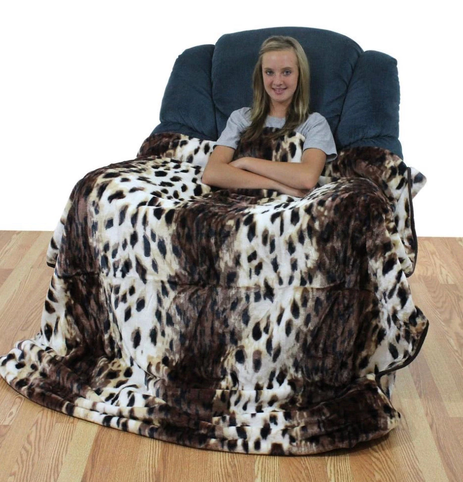 Our huge 63 inch by 86 inch throw blanket can also be used as a twin bedspread. The hi pile raschel knit blanket, provides a super soft feel and awesome color. Whether you are cuddling on the couch or tailgating at the big game, this throw blanket has got you covered. Made from 100% polyester, this blanket can be machine washed in cold water. It can be tumble dried on a low temperate, but can also be allowed to air dry. Imported.