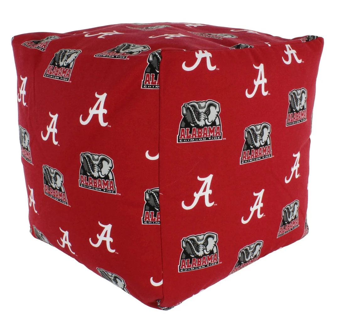 ur NCAA licensed Cube Cushion Pouf Chair Bean Bag Ottoman, pouf chair or square chair is a great addition to any patio, tailgate spot, dorm room, game room or fan cave. This cushion is made with UV treated high spun polyester, to resist stains, mildew, weather and fading in sunlight. This cushion or chair works great for any number of things: extra dorm room chair, foot rest in your patio or pool area, on the go seating while tailgating or a perfect chair in your child’s game room. Our Cube Cushion Pouf Chair Bean Bag Ottoman or square chair is filled with a 100-percent recycled polystyrene beads sourced from South Dakota and stuffed and finished right here in Nebraska. Lightly spot clean or hand wash with a mild detergent and cool water, allow to air dry. Measures 18-inches long x 18-inches wide x 18-inches high.