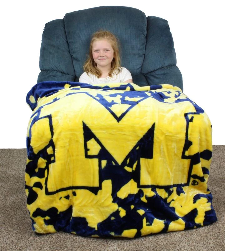 Our huge 63 inch by 86 inch, Michigan Wolverines throw blanket, can also be used as a twin bedspread. The hi pile raschel knit blanket, provides a super soft feel and awesome color. Whether you are cuddling on the couch or tailgating at the big game, this throw blanket has got you covered. Made from 100% polyester, this blanket can be machine washed in cold water. It can be tumble dried on a low temperature, but can also be allowed to air dry. Imported.