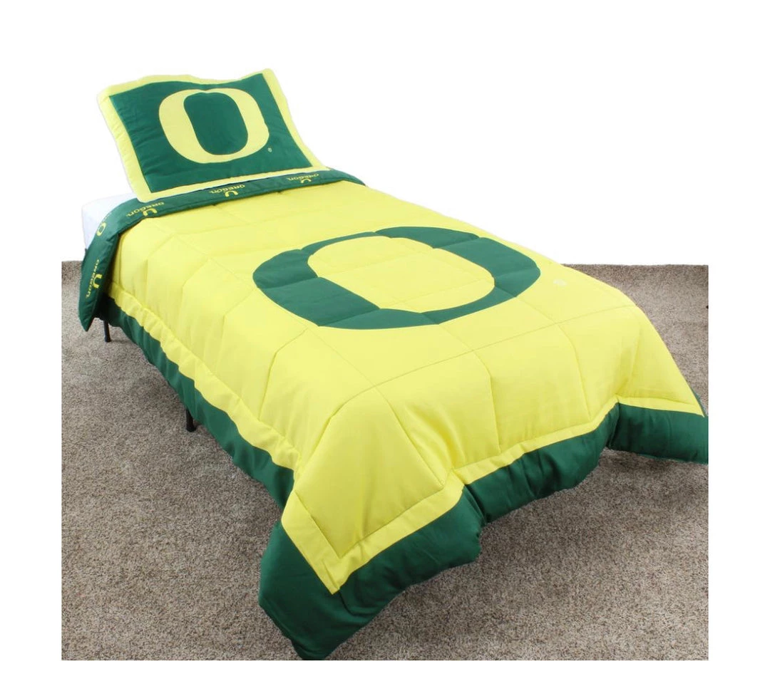 Oregon Ducks licensed, College Covers branded comforter set includes everything you might need to decorate a team themed bedroom. Our sheet sets and dust ruffles are also available, but not included in this set. The comforter is quilted to eliminate the poly fill from bunching. Our 100 percent cotton, 200 thread count bedding is machine washable. We recommend to use a oversized commercial washer and dryer to wash and dry to eliminate any fabric rubbing on the sides, this could potentially cause problems. Wash in cold water with like colors and tumble dry on a low heat.
