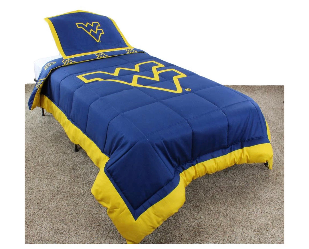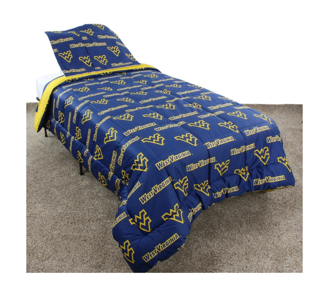 West Virginia Mountaineers licensed, College Covers branded comforter set includes everything you might need to decorate a team themed bedroom. Our sheet sets and dust ruffles are also available, but not included in this set. The comforter is quilted to eliminate the poly fill from bunching. Our 100 percent cotton, 200 thread count bedding is machine washable. We recommend to use a oversized commercial washer and dryer to wash and dry to eliminate any fabric rubbing on the sides, this could potentially cause problems. Wash in cold water with like colors and tumble dry on a low heat.