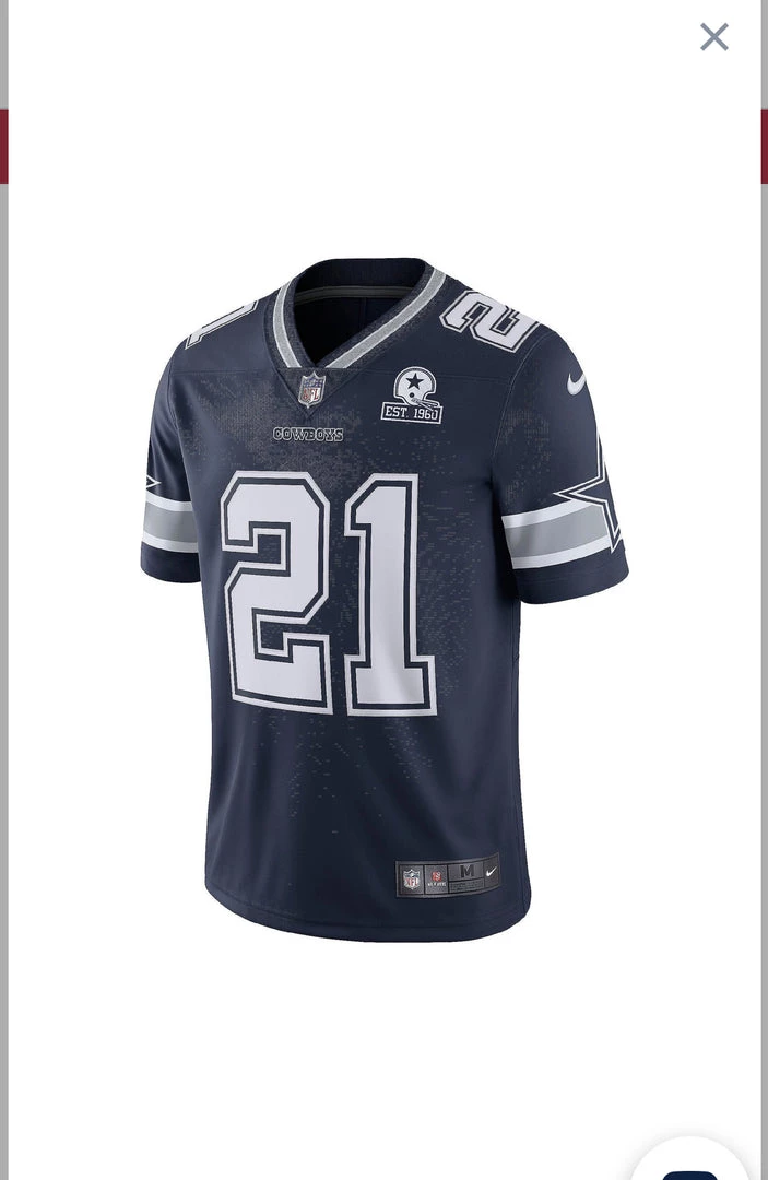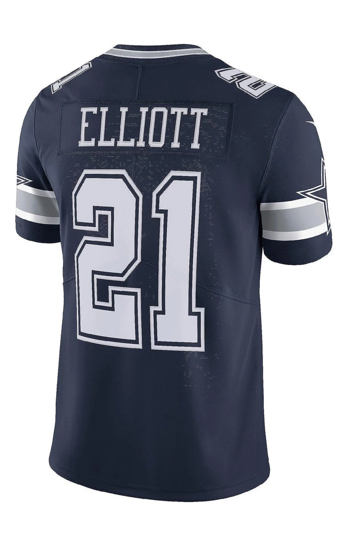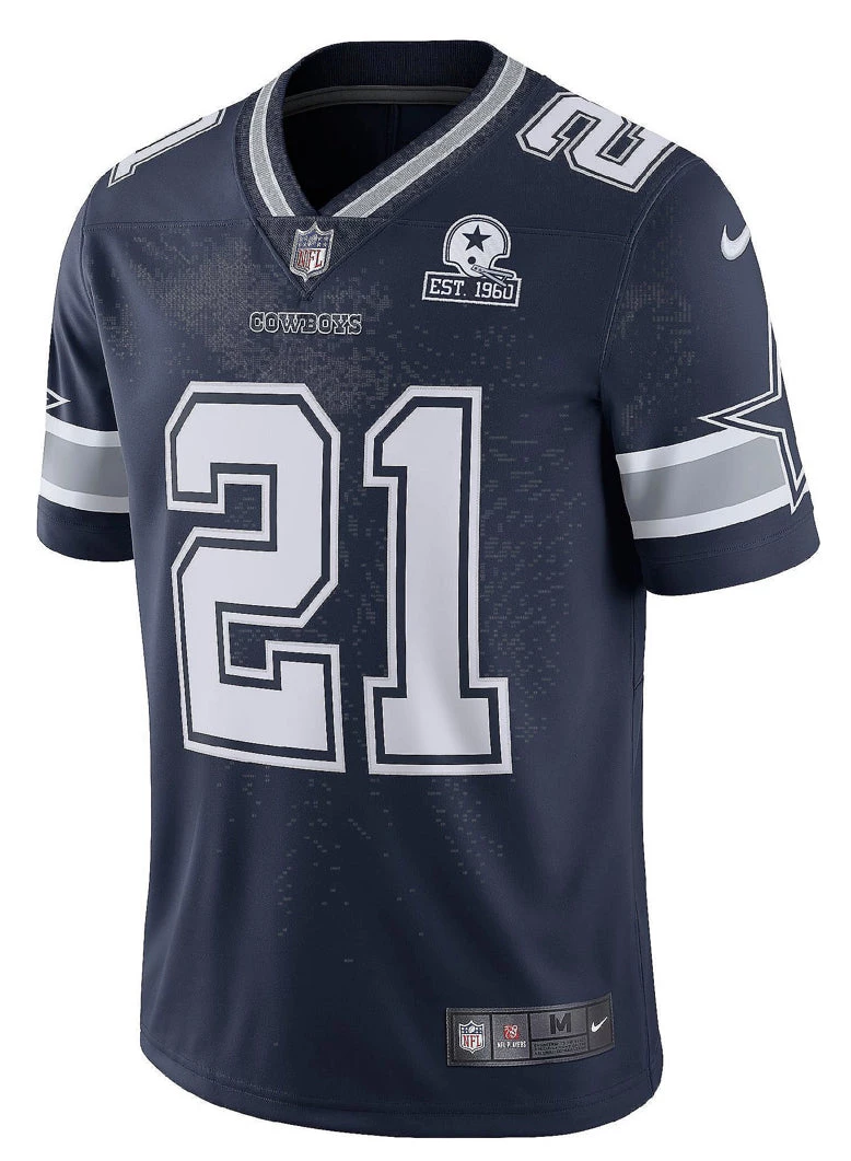 Celebrate 60 years with the Dallas Cowboys and get the Dallas Cowboys Ezekiel Elliott #21 Nike 1960 Navy Vapor Limited Jersey. This Nike Dallas Cowboys Elliott jersey is a high quality replica jersey that combines the look of the authentic on field jersey with everyday style. The chainmaille mesh grill at the front neck and sewn-on tackle twill graphics enhance the classic Cowboys style, and the premium team detailing and back seam lines elevate the look to a new level.