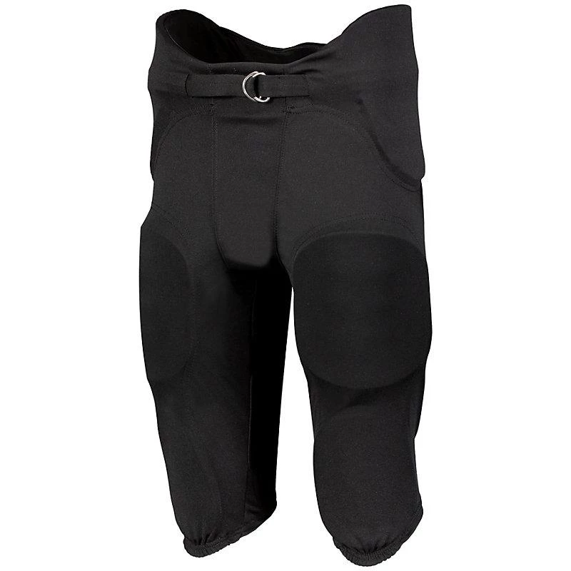 DESCRIPTION: Enjoy durable performance with the Russell Athletic® Youth Integrated 7-Piece-Pad Football Pants. They feature a 7-piece integrated pad set with ventilated hip and spine pads. These football pants have contour knee pads and a bartacked 1-inch web belt included. 100% polyester double knit “R RUSSELL” on center back 1″ web belt inserted and bar tacked Covered belt on Adult 7-piece integrated pad set includes, ventilated hip & spine, reinforced thigh pads and contoured knee pads