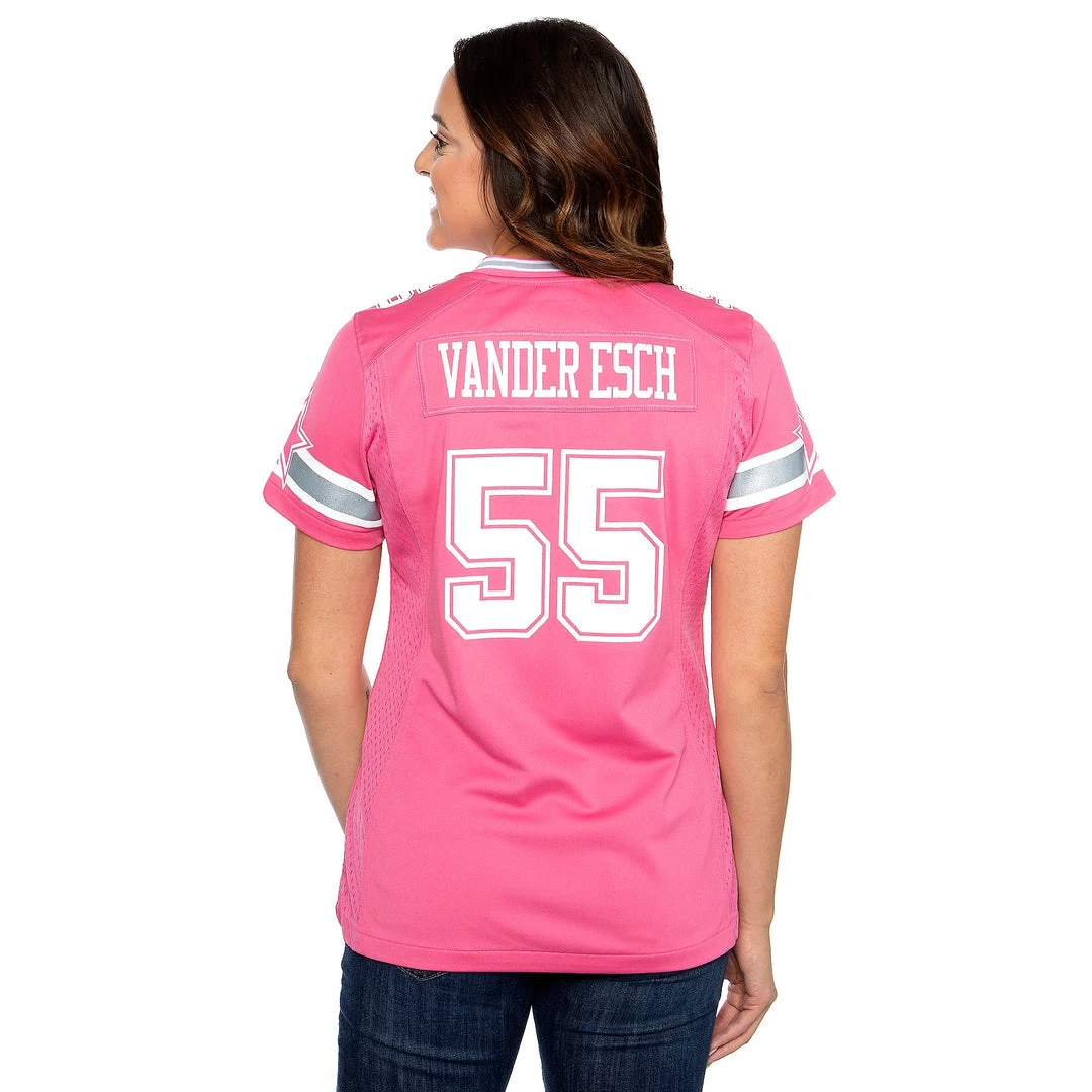 We present the Dallas Cowboys Womens Leighton Vander Esch #55 Pink Jersey. This Nike Cowboys jersey features solid-body construction and silicone graphics.