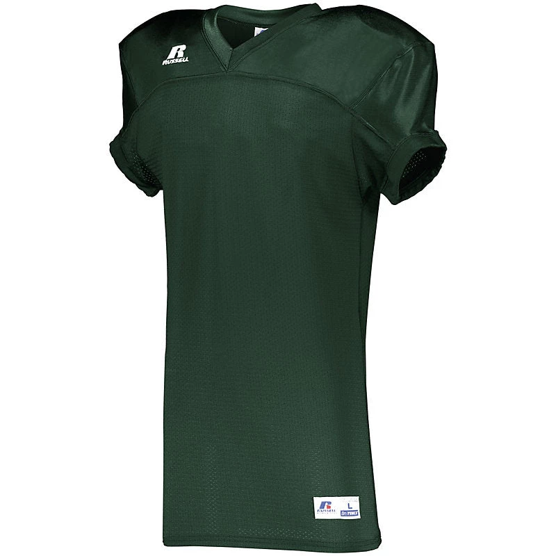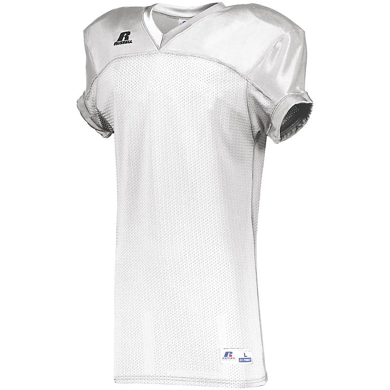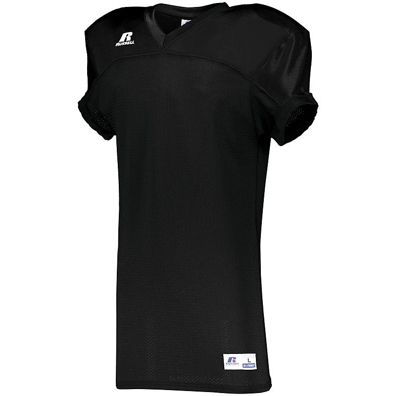 FOR DECORATION PLEASE EMAIL [email protected] DESCRIPTION: Move freely in in the Stretch Mesh Game Jersey by Russell Athletic. Its durable compression fit stretch mesh delivers unrestricted range of motion, and this football jersey also sports a reinforced 73 cloth yoke for added durability. 88% nylon/12% spandex (colors), 90% polyester/10% spandex (white) durable compression fit mesh delivers unrestricted range of motion Reinforced 73 cloth yoke for added durability in contact area Skill cut 73 cloth sleeves for complete pad coverage * Outside locker label V-neck collar Set-in sleeves