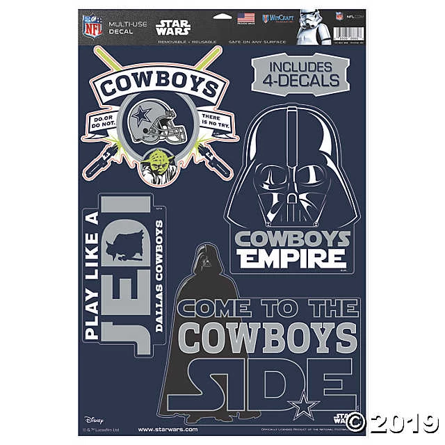 SHIPS SAME DAY Show your spirit for America’s team, the Dallas Cowboys, by placing these NFL® Dallas Cowboys™ Star Wars™ Decals in fun places. Welcome guests to your football party with these decals on your front door window or stick them on your car window, laptop case, etc. Because these Dallas Cowboys decals don’t leave a sticky residue, you can use them as football party decorations and let the force be with your team! Vinyl. Includes 4 decals on 11″ x 17″ sheet. Made in the USA. © NFL Properties LLC.