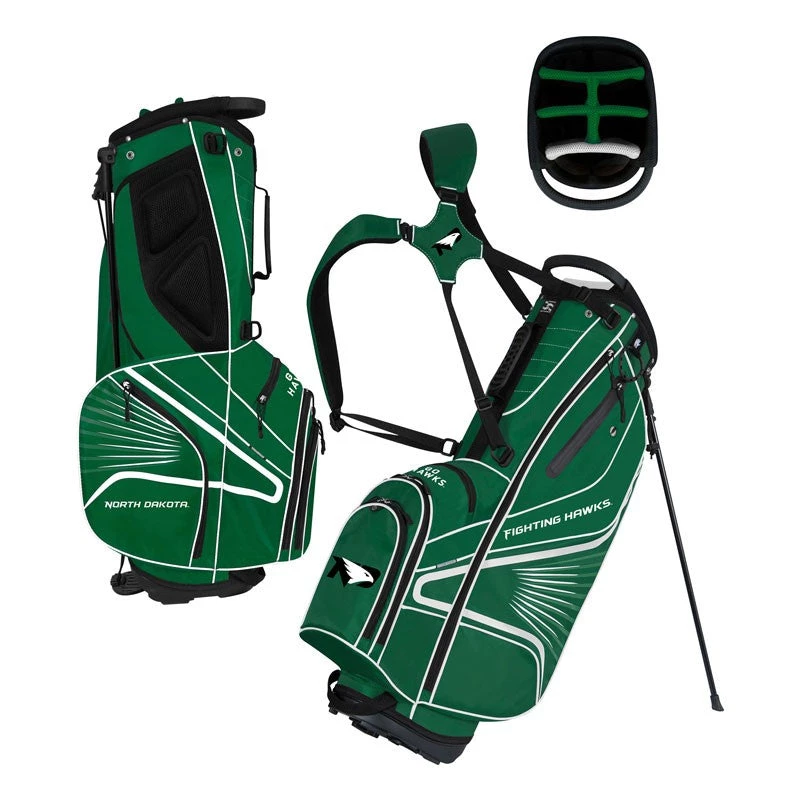 Designed to keep your gear close-at-hand, the GridIron III Stand Bag features eight strategically placed zippered pockets to accommodate all needs including velour lined valuables pocket featuring a waterproof bonded zipper, apparel pocket, and three accessory pockets. Adding convenience are two integrated pockets featuring space for your score card as well as a thermal-lined cooler pocket that will accommodate up to a 700mL bottle for all your hydration needs.6-way organizer top keeps clubs in order. Long-lasting sculpted hip pads and padded dual strap allow you to comfortably and efficiently carry the weight of your bag. Rounded pocket openings allow easier access to pocket contents. The bag is made of ultra-lightweight 210D nylon and a durable leg stand system. Other features include removable zippered rain hood, oversized towel ring,glove patch, and pen sleeve, and two-point umbrella holding system. The GridIron III Stand Bag is embellished with five team trademarks